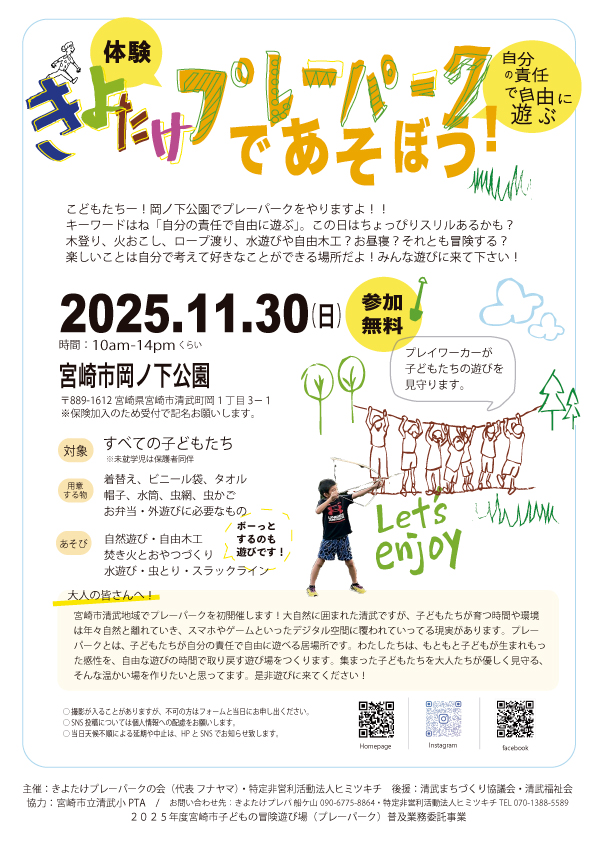 2025年11月30日(日)10時~14時まで、清武町の岡ノ下公園で体験プレーパークを開催します!