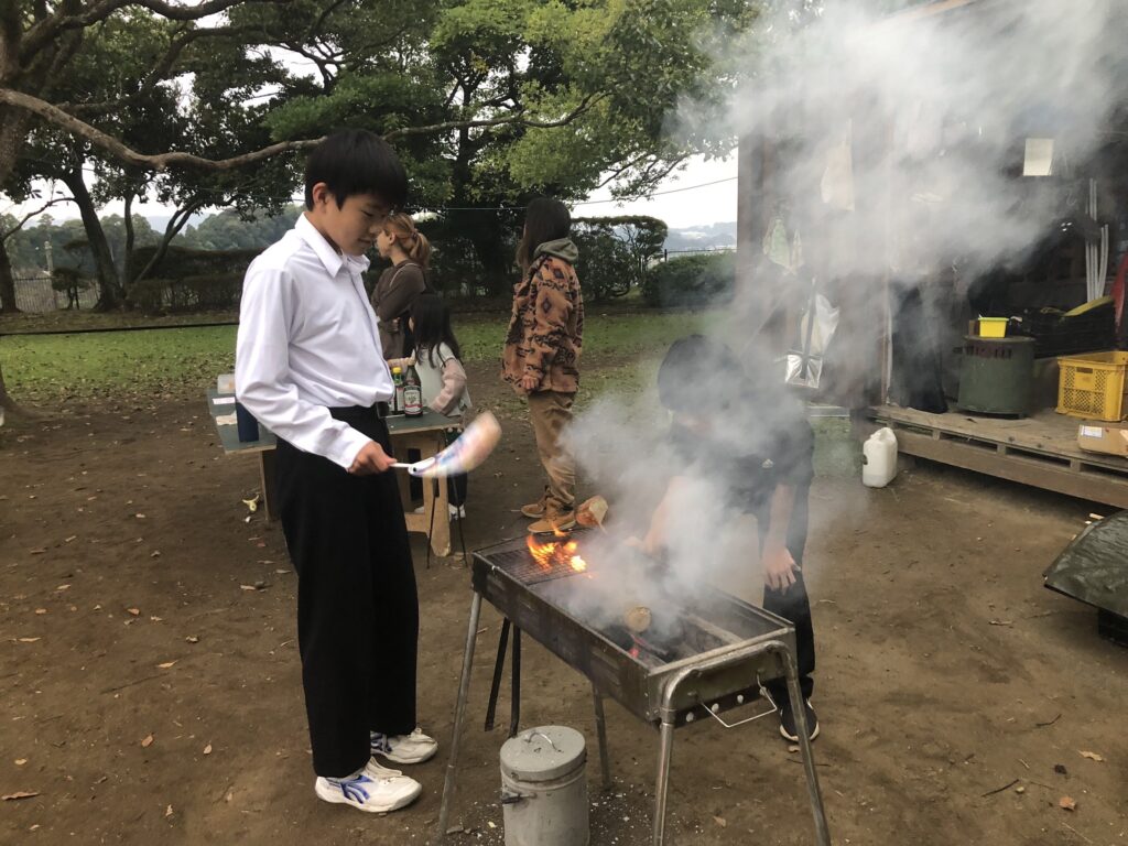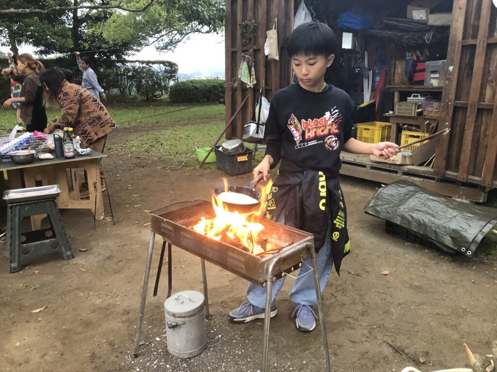 スタッフと一緒にまぜまぜ、煙が目にしみるけど、がんばってつくります。