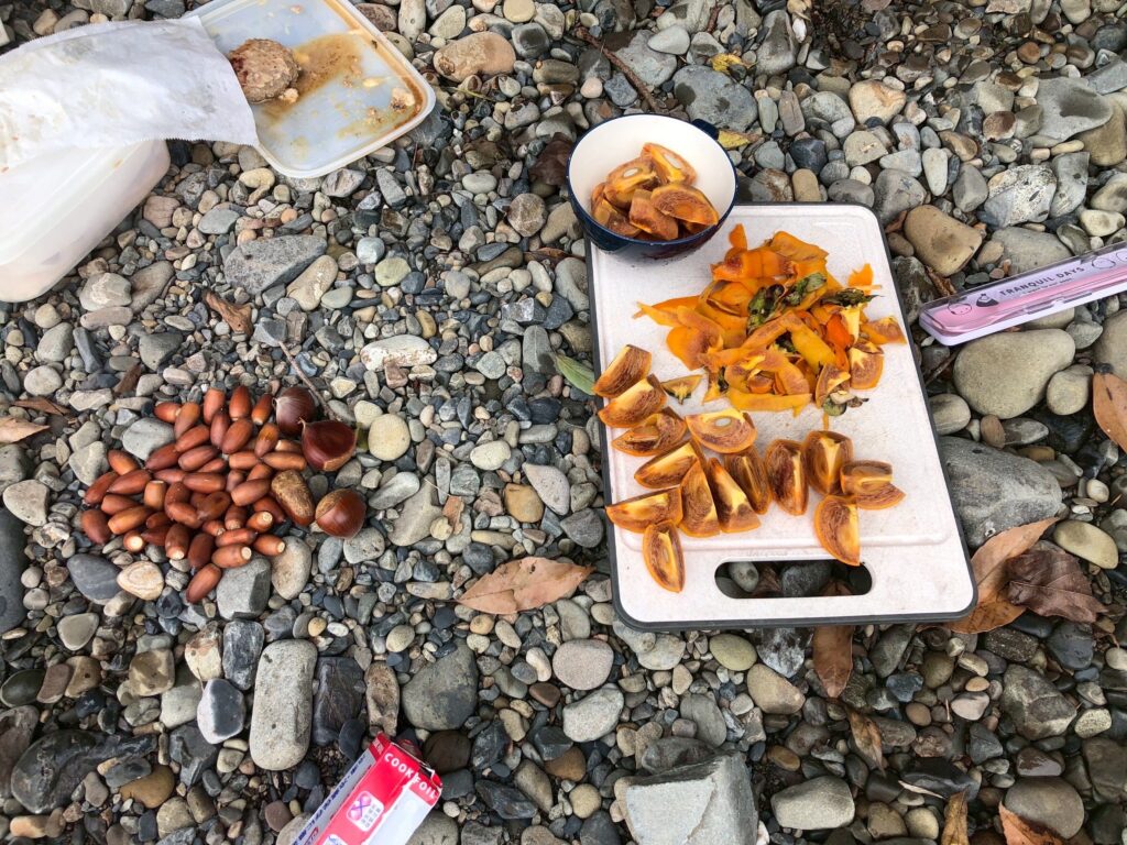 秋ならではのマテバシイ(どんぐり)や栗を焼いたり、柿を切って食べたり。